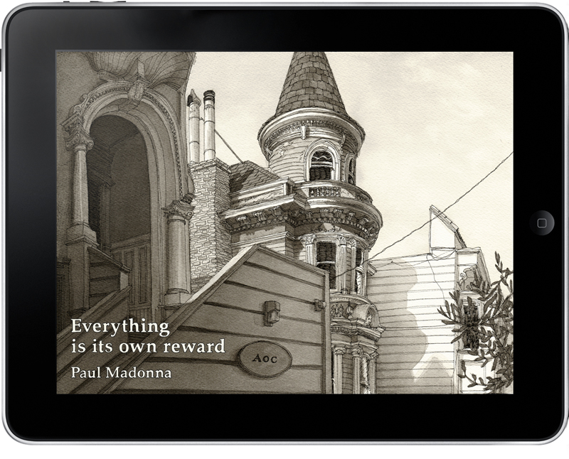 When City Lights and I made both the first and second volumes of All Over Coffee, we set out to make high-quality objects, believing that the future of the printed book lies in creating beautiful objects people want to own. I feel that All Over Coffee is best served in print because print best resembles the original drawings, however, the creative potential of the internet and digital media is immeasurable, so I created this abridged app version of the new book to explore that range of possibilities. With this project, I was able to make my All Over Coffee strips interactive in ways that print could never allow, and in turn, discovered new potential for this series. I found that the printed volume and the electronic version are such decidedly different mediums, that when asking which best serves the content, the answer is not necessarily either/or. When the unique capabilities of each medium are fully explored, neither excludes the other. Because the age of apps and digital books is still relatively young, I have chosen to give this electronic version away for free in hope that it will attract new readers to my work. So if you have enjoyed this digital rendition of Everything is its own reward, please purchase the printed book to possess the complete body of this work. |
