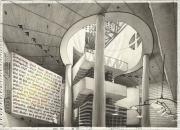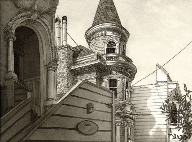 #502, published 05 23 10, Watari-Um Museum, Tokyo, Japan Spring in Japan is known for Cherry Blossoms, and I was nervous that we were going to miss them. Which we did. We arrived April 15th, just after their early bloom. Still, seemed like a perfectly scheduled time for a drawing trip, spring; not too hot but with a low light for long shadows. But instead, winter came back and confused everyone, including the Cherry trees. It snowed the second day we were there. Not even a pretty snow, but white for half an hour, only to turn to hail then rain. So all it really meant was that it would be cold. I still managed to get a lot of good drawing in, because a discipline built on drawing outdoors means you can't use the weather as an excuse. Still, some days became more about interiors than exteriors, but either way, had it had been raining or sunny, we definitely would have visited the Watari-Um Contemporary Museum. The Watari was designed by Swiss architect Mario Botta, who also designed the San Francisco Moma, and there are some familiar elements, like stripes. The Watari, by the way, also has an excellent bookstore, On Sundays, which I'm proud to say carries my books. Their exhibition at the time was a body of drawings by musician and actor John Lurie. Incredibly moving, and I later learned that John Lurie suffers from an undiagnosed illness that for years has limited his creative output to only visual art. This added a new perspective to all the pieces, and of course, many seemed to make more sense. One measure of great work for me is a feeling of familiarity, of a truth that I feel I know but have never heard before. And a feeling that that truth is what I need to bring to my own work, which John Lurie's pieces had for me. So I had to pay homage. This is the first of many pieces to come from my recent trip to Asia, which included Tokyo and Shanghai. |