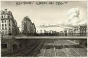 #492, published 03 07 10, Paris Looking over the tracks leaving Gare du Nord in Paris, all the trains were quietly stopped at the station on the other side of the bridge I was standing on. I thought of the artist Raymond Pettibon's series of train drawings, how the scene was the opposite of his pulsing engines, but completely aoc. |